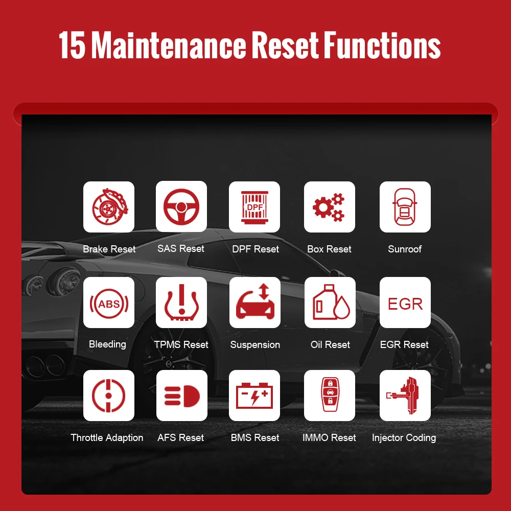 1.Oil Lamp Reset Service : allows you to perform reset for a new calculation of Engine Oil Life system once changed the oil. 2.EPB service: it is important in the maintenance of electronic braking system's safety and efficiency. 3.BAT battery service : allows the scan tool to evaluate the battery charge state, monitor the close-circuit current, register the battery replacement, and activate the rest state of the vehicle. 4.DPF service : specially works for Diesel Particulate Filter system with DPF regeneration, DPF component replacement teach-in and DPF teach-in after replacing the engine control unit. 5.SAS service: helps clear the fault steering angle sensor memories and plays an important role in the steering angle sensor calibration. 6.TPMS service : makes sense in displaying sensor IDs from the vehicle's ECU, inputting TPMS sensor replacement IDs and testing sensors. 7.IMMO Key Programming: the unique car key programming and read pin code function, it is mainly used to disable the lost vehicle keys and program a new replacement key fob. 8.ABS Bleeding : ABS brake bleeding to get a firm brake pad after air exhaustion after repair ABS pump system 9.Sunroof Reset: The sunroof memory generally needs to be reset when the vehicle’s battery is replaced or the car dies 10.Suspension Reset:Try reset electronic suspension air ride with the massage system close all doors koeo flip through measage system go to suspension reset or on off 11.Gearbox Reset Procedure Reset Transmission Adaptive Learning DIY. Start the car and drive. Once you perform this procedure the Engine Control Unit (ECU) and Transmission Control Unit (TCU) will work together to learn how you drive by monitoring your driving pattern. After you follow this programing method of the TCU / ECU drive the car. 12.AFS Headlamp Reset 'AFS' means Adaptive Front lighting System (at night with the Bi-Xenon headlights) it swivels either side, pressing that button means they stay pointing straight ahead and don't turn when you turn the steering wheel 13.Injector Coding Leaking injectors and some dead injectors can be missed even when an injector is disabled. Otherproblems with the ignition system and mechanical components also may not show an rpm loss when aninjector is turned off 14.Throttle Adaptation The throttle body is a tube containing a pivoting flat valve (butterfly) that is used to control the amount ofair entering an engine. In an electronically fuel injected car, a throttle position sensor and air flow sensorcommunicate with the computer, which supplies the corresponding amount of fuel needed at the injectors. It must need re-learning throttle sensor position after clearing or repair 15.Gear Learning: The scan tool monitors certain camshaft position sensors signals to determine if all conditions are met to continue with the procedure for Engine running