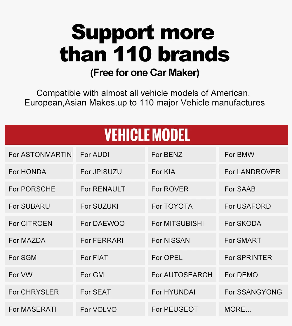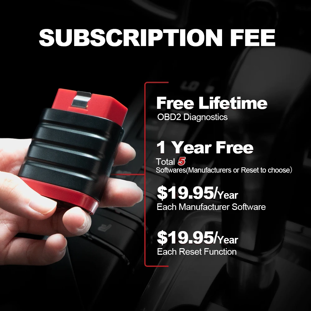 1.Car Model Software:If you have more model diagnostic needs,you can buy in our App,each model software priced at $19.95 per year.Full system diagnostics and special features are included in each model software. 2.Maintenance Software:Also you can choose to purchase maintenance software directly,it's also $19.95 per year,which can be used for maintenance of all different models,not limited to one car brand. Preferential Activity:Originally sent 1 software for free one year,now send total 5 software(Manufactures or Reset to choose) for free one year.Don't miss the chance.