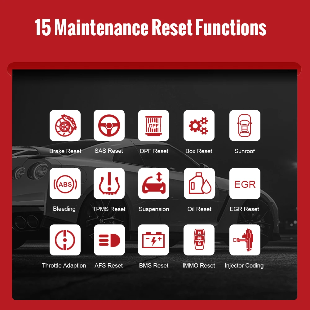 This OBD2 scanner is specially designed to provide you with quick access to the vehicle systems for various scheduled service and maintenance performances. There is some commonly-used special reset services are listed for your reference: 1.Oil Lamp Reset Service : allows you to perform reset for a new calculation of Engine Oil Life system once changed the oil. 2.EPB service: it is important in the maintenance of electronic braking system's safety and efficiency. 3.BAT battery service : allows the scan tool to evaluate the battery charge state, monitor the close-circuit current, register the battery replacement, and activate the rest state of the vehicle. 4.DPF service : specially works for Diesel Particulate Filter system with DPF regeneration, DPF component replacement teach-in and DPF teach-in after replacing the engine control unit. 5.SAS service: helps clear the fault steering angle sensor memories and plays an important role in the steering angle sensor calibration. 6.TPMS service : makes sense in displaying sensor IDs from the vehicle's ECU, inputting TPMS sensor replacement IDs and testing sensors. 7.IMMO Key Programming: the unique car key programming and read pin code function, it is mainly used to disable the lost vehicle keys and program a new replacement key fob. 8.ABS Bleeding : ABS brake bleeding to get a firm brake pad after air exhaustion after repair ABS pump system 9.Sunroof Reset: The sunroof memory generally needs to be reset when the vehicle’s battery is replaced or the car dies 10.Suspension Reset:Try reset electronic suspension air ride with the massage system close all doors koeo flip through measage system go to suspension reset or on off 11.Gearbox Reset:Procedure Reset Transmission Adaptive Learning DIY. Start the car and drive. Once you perform this procedure the Engine Control Unit (ECU) and Transmission Control Unit (TCU) will work together to learn how you drive by monitoring your driving pattern. After you follow this programing method of the TCU / ECU drive the car. 12.AFS Headlamp Reset :'AFS' means Adaptive Front lighting System (at night with the Bi-Xenon headlights) it swivels either side, pressing that button means they stay pointing straight ahead and don't turn when you turn the steering wheel 13.Injector Coding :Leaking injectors and some dead injectors can be missed even when an injector is disabled. Otherproblems with the ignition system and mechanical components also may not show an rpm loss when aninjector is turned off 14.Throttle Adaptation The throttle body is a tube containing a pivoting flat valve (butterfly) that is used to control the amount ofair entering an engine. In an electronically fuel injected car, a throttle position sensor and air flow sensorcommunicate with the computer, which supplies the corresponding amount of fuel needed at the injectors. It must need re-learning throttle sensor position after clearing or repair 15.Gear Learning: The scan tool monitors certain camshaft position sensors signals to determine if all conditions are met to continue with the procedure for Engine running
