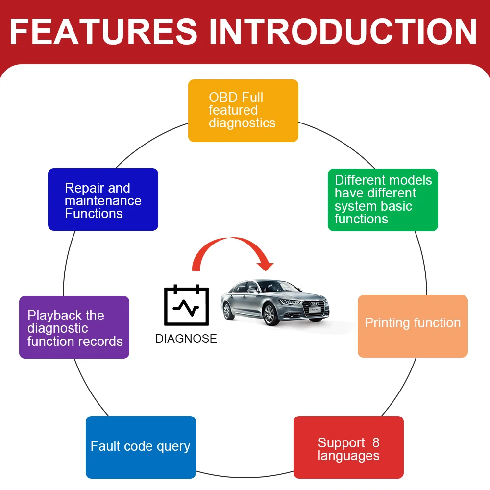 The diagnostic tool can help detect the engine ignition, fuel injection, air and fuel ratio, and exhaust emission conditions in Engine system to enhance vehicle performance, save energy and reduce exhaust emission.